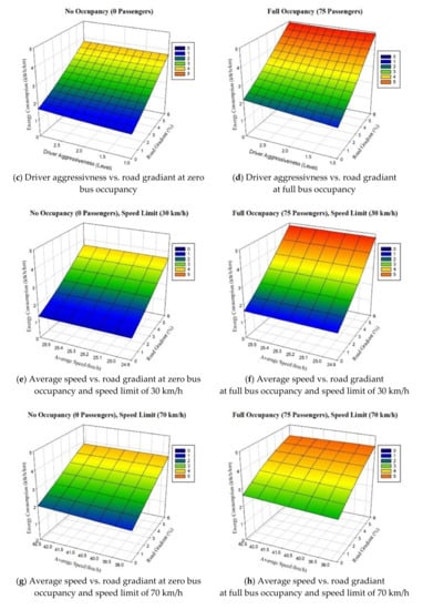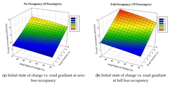Previous studies concluded that the average speed and acceleration rates significantly affect energy consumption [45,47]. Intuitively, air conditioning and heating systems increase the consumed energy significantly [45,53]. For topological parameters, the road grade shows the greatest change in energy consumption rates. Moreover, there is a significant range in the consumed energy associated with positive and negative grades [20,45,48,53]. Furthermore, Qi [52] deduced that the consumed energy decreases when the trip distance or ambient temperature increases. Additionally, they argued that energy consumption does not change significantly when the initial state of charge changes.
