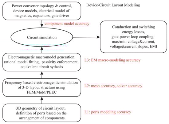 - Le, Q.; Evans, T.; Peng, Y.; Mantooth, H.A. PEEC Method and Hierarchical Approach Towards 3D Multichip Power Module (MCPM) Layout Optimization. In Proceedings of the IEEE International Workshop on Integrated Power Packaging (IWIPP), Toulouse, France, 24–26 April 2019; pp. 131–136. [Google Scholar] [CrossRef]