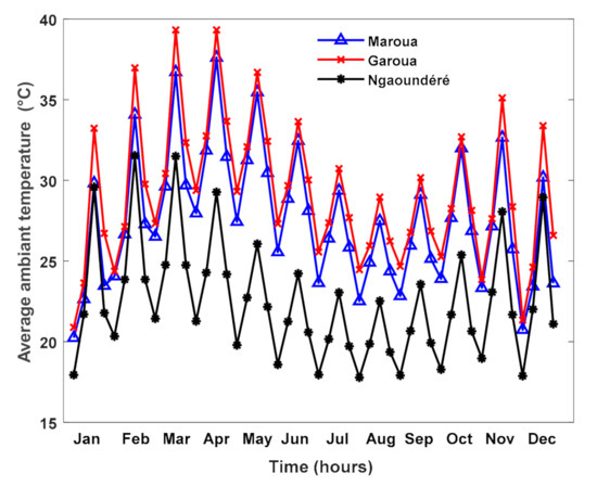 Time variation of ambient temperature over the year for Maroua, Garoua, and Ngaoundéré. The time variation interval is Δt = 6 h.