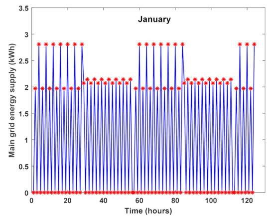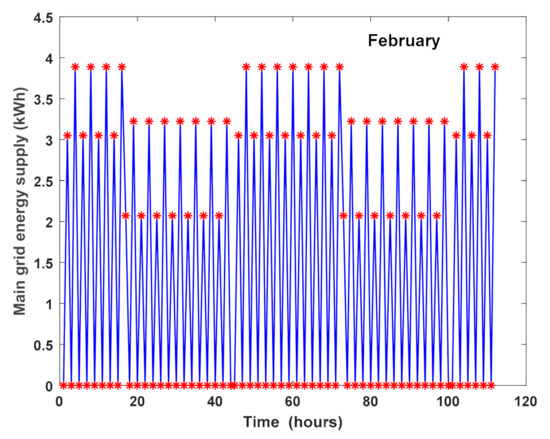 Figure 6 and Figure 7 present the daily distribution of the main grid energy supply for the months of January and February, respectively, corresponding to two interchangeable scenarios after a duration of 1 week. For the month of January (corresponding to k = 1), the first scenario is defined by x1 = 0, x2 = 1.970, x3 = 0, x4 = 2.807; the second scenario is defined by x1 = 2.071, x2 = 0, x3 = 2.143, x4 = 0. For the month of February (corresponding to k = 2), the first scenario is defined by x’1 = 0, x’2 = 3.050, x’3 = 0, x’4 = 3.887; the second scenario is defined by x’1 = 2.071, x’2 = 0, x’3 = 3.223, x’4 = 0. The stars in red color correspond to each 6 h time interval and reflect either the availability of energy or the electrical load shedding (blackouts).