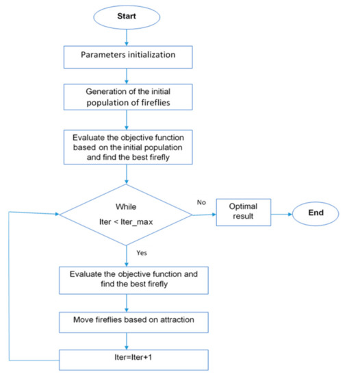 This study is based on a multi-objective optimization to determine the optimal key parameters of the system while minimizing the cost and ensuring an efficient satisfaction of the load energy required. Multi-objective optimization appears as a powerful tool for the optimal sizing of stand-alone PV and hybrid systems [27,28,29,30,31,32,33,34,35]. Recently, the multi-objective optimization using evolutionary algorithms has emerged as a promising optimization technique for energy systems [28,29,30,31,32,33,34,35,36]. The most used evolutionary algorithms for energy systems optimization are genetic algorithm and particle swarm optimization methods [28]. However, because of its good and rapid convergence to the solution, this study focused on a multi-objective optimization based on a firefly algorithm [37,38,39,40]. The flowchart of the firefly algorithm is presented in Figure 8. The algorithm is used to minimize two objective functions. The first objective function defined by Equation (22) is based on the net present cost (NPC) of the energy system, including the initial costs, the installation costs, the operation and maintenance costs, and the replacement costs of the system components. It is given by: