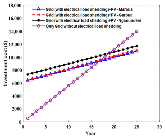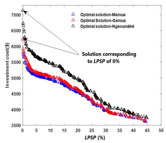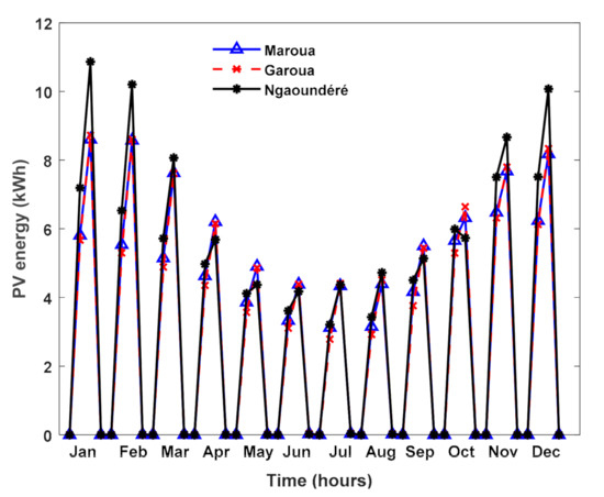 The hybrid PV/Battery/Grid-connected system considered in this study, taking into account the electrical load shedding, was simulated for three different cities in the northern part of Cameroon. Two different electrical load shedding configurations were taken into account and interchanged after a period of 7 days (1 week), as shown in Table 2. Each day (lasting 24 h) is divided into 4 time slots of 6 h each. These time slots define the periods of availability and non-availability of electrical currents. Indeed, for a 24 h day, electrical energy is available every 6 h of elapsed time, followed by 6 h of electrical blackouts. Each 6 h of unavailability of electrical energy is covered either directly by the PV generator or by the batteries. The Pareto front is used to determine the optimal configurations of the studied system, thus making it possible to define the size of these components. The simulation is performed with a maximum number of 10 iterations and the initial population size (or the number of fireflies) is 1000. In Cameroon, electrical energy supplied by the national electricity distribution company is billed at 79 Fcfa/kWh (Cameroonian currency), or USD 0.15/kWh. Figure 9 shows different optimal solutions obtained depending on the reliability and the investment cost of the system for the cities of Maroua, Garoua, and Ngaoundéré. It emerges from this obtained result that the investment costs of the system are higher in Ngaoundéré compared to Maroua and Garoua. However, a slight difference is observed between the investment costs in Maroua and Garoua. The implementation of this system would be less expensive in Maroua and Garoua compared to Ngaoundéré. However, it is noted in Table 5 (which shows the optimal configuration of the system studied corresponding to LPSP of 0% for the three cities considered) that for an LPSP of 0%, the investment costs in Maroua and Garoua are equal (of USD 6225.6); this cost is higher in Ngaoundéré (USD 7136.6). Figure 10 presents the monthly time variation interval of PV energy production for the optimal configuration corresponding to LPSP of 0% for Maroua, Garoua, and Ngaoundéré. Although the solar potential of Garoua and Maroua is greater than that of Ngaoundéré (see Figure 2), their high ambient temperatures also limit the energy production. There is not much difference between PV energy produced in Maroua and Garoua due to almost similar weather conditions in the two areas. In Figure 10, PV energy production in Ngaoundéré is higher than that of Maroua and Garoua because the number of PV modules for the optimal solution corresponding to LPSP of 0% is 10 in Ngaoundéré, while it is eight in both Maroua and Garoua for the same type of module.