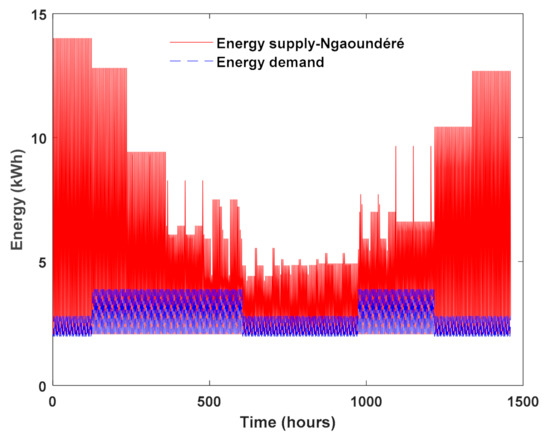 The daily electrical energy demand of one household presented in Table 1 depends on the time of the year because some devices such as ceiling fans will not be used when the weather is cold. Figure 5 presents the profile of the daily energy demand of one household depending on the month of the year. Indeed, for an optimal sizing of the system, the present study considers a variable load influenced by the weather conditions. For the periods of the year spanning from February to May and from September to October, the weather is hot and the use of a ceiling fan is necessary. Conversely, for the periods of the year spanning from June to August and from November to January, the weather is cold and there is no need to use a ceiling fan. The use of the ceiling fan increases the load demand.