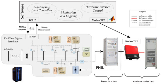 For the combined SIL-PHIL simulation, the laboratory test environment depicted in Figure 3 is used. In this setup, one of the PV inverters is replaced with a real component that represents the HuT of the PHIL test and the self-adapting algorithms represent the software under test of the SIL simulation. Thus, the self-adapting controllers are implemented in another software which interacts with the real-time simulation through reading local voltage measurements and sending the derived shifting setpoints.