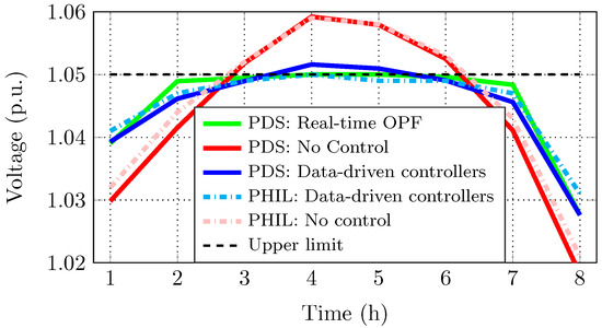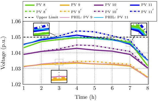 In this part, we assume that a new PV unit is installed at node 6 with the same installed capacity as the PV unit at node 10. This unit is operating according to the standard volt/var curve as indicated in the grid codes [14] and the location is chosen such that its impact on the neighboring nodes is significant (installations closer to the secondary of the transformer where voltage is regulated would have less impact on the system). Figure 6 shows the voltage evolution with (solid lines) and without (dash-dotted lines) the online modification of the volt/var curves. The shifting step is set to p.u. and it was adequate to reduce the overvoltage issues of node 11. The combined SIL-PHIL experiment which considers the self-adapting algorithm confirmed the simulation results as can be seen by the voltage measurements at nodes 9 and 11.