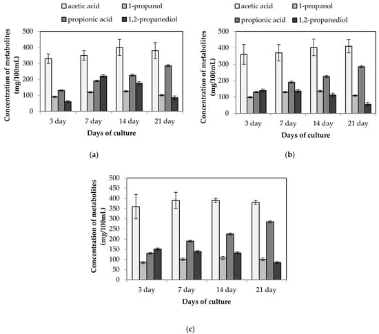 Metabolite profile of supernatant resulting from co-fermentation of strains L. buchneri KKP 2047p and L. diolivorans KKP 2057p in medium containing 8.0 g/L 1,2-propanediol and glucose as a carbon sources in concentration: (a) 2.5 g/L; (b) 5.0 g/L; (c) 10.0 g/L. There was showed a standard deviation for each measurement.