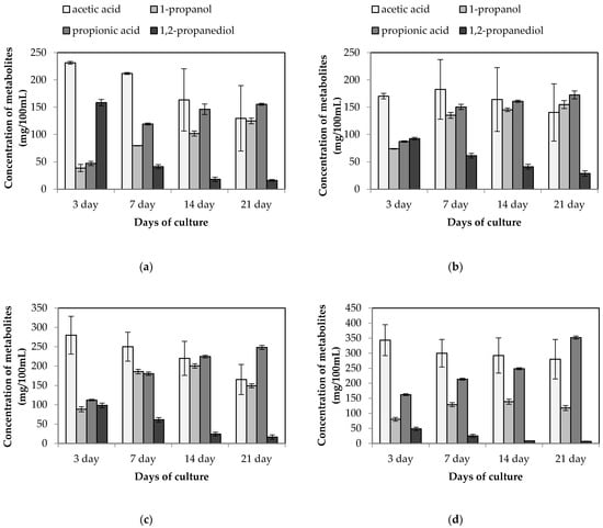 Metabolite profile of supernatant resulting from P. acidilactici KKP 2065p (a–c) culture and co-fermentation of strains L. buchneri KKP 2047p and P. acidilactici KKP 2065p (d) in medium containing glucose and/or 1,2-propanediol as a carbon sources (a)–medium containing 6.0 g/L 1,2-propanediol; (b) medium containing 6.0 g/L 1,2-propanediol and 5.0 g/L glucose; (c,d) medium containing 8.0 g/L 1,2-propanediol and 5.0 g/L glucose. There was showed a standard deviation for each measurement.