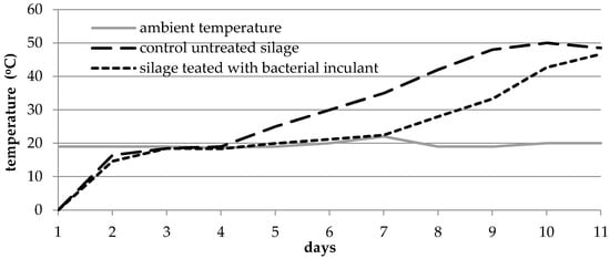 The oxygen stability test was carried out for 11 days after opening the silo by temperature analysis. Experimental silages with the addition of Biogas A inoculant were characterized by extended aerobic stability up to 7 days, while control silages without the addition of the preparation were stable for only 4 days (Figure 3). The similar observations were made for the second bacterial starter culture Biogas B (data not shown).