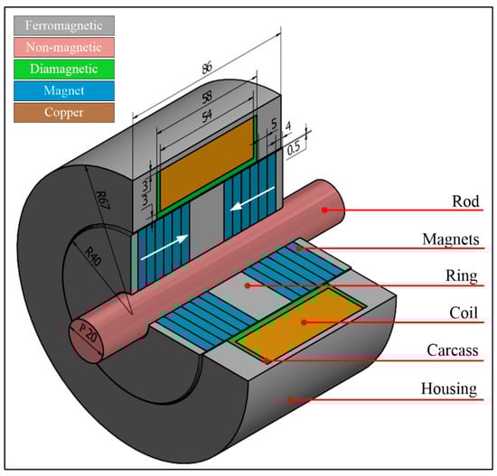 The structure of the EV-EH with the dimensions of its structural components are shown in Figure 1. The unit is symmetrical and features a non-magnetic rod with two sets of six radially magnetised neodymium magnets and a coil placed inside a housing, which acts as a shield against magnetic disturbances. The magnet assemblies are faced with each other and separated by a ring. Inside the housing, there is a carcass on which the foil winding (260 turns) is made of the one-side insulated coil. The details of EV-EH components are described in [24]. According to Faraday’s law, the EV-EH produces electrical energy from the relative motion of magnets against the coil. The induced in the coil is linked to the product of the velocity and the flux linkage gradient, which is dependent on the applied magnets to produce the field, the arrangement of the magnets, the area, and the number of turns of the coil. The magnetic characteristics of the magnets and ferromagnetic material used are provided in Figure 2. The measured resistance and the inductance of the EV-EH coil are and , the electric constant is .
