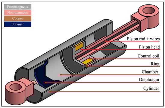 The structure of the MR damper is shown in Figure 3. This is a typical mono-tube range MR damper (RD-8040-1 short-stroke series of Lord Corporation) [25] with is suitable for most development applications. The annular flow path in the piston assembly and the chamber is filled with MR fluid. In the lower part of the chamber, there is a diaphragm separating MR fluid from the gas-charged accumulator. The control coil is wrapped around a piston core. The damper force is controlled by the magnetic field induced via input current in the control coil. The key mechanical and electrical properties of the damper are as follows: stroke , min. force (for and ), max. force (for and ), input current (continuous for ) – max. , (intermittent) max., supply voltage DC. The measured resistance of the control coil is and the inductance [26].