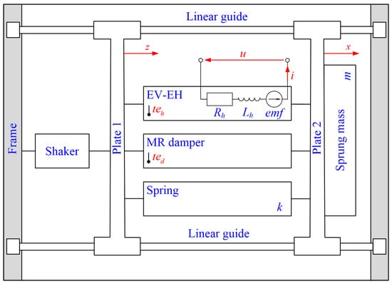 The aim of the research was to demonstrate that the EV-EH exhibited self-sensing and self-powered capabilities and can be applied to control an MR damper in a vibration reduction system. The tests were conducted in a test rig equipped with the electrodynamic shaker LDS V780 [27]. The test rig (see Figure 4) consisted of a steel frame and plates 1 and 2, which could move horizontally on linear guides. The EV-EH, the MR damper, and the spring are installed in parallel between plate 1 and plate 2. The sprung mass was and the spring stiffness coefficient was Such selection of and parameters allow for compensating the MR damper diaphragm stiffness. This is important for the correct operation of EV-EH. The geometrical structure of EV-EH is designed to ensure linear operation in the range of . The parameters defining the structure of the remaining elements of the test rig were selected so that in the standby mode, the EV-EH ring was in the middle position in relation to the coil, and in the operating mode, the displacement of the magnets in relation to the coil was within a defined range.