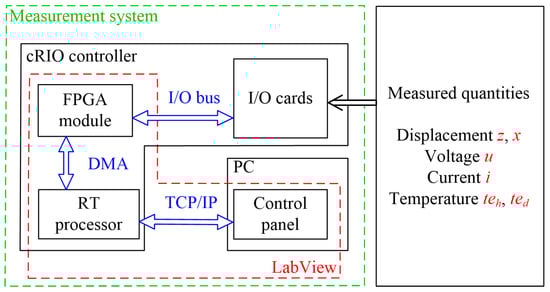 The measurement system dedicated to the test rig consisted of a cRIO 9063 [28] controller, a personal computer, a set of transducers, and measurement cards (see Figure 5). The application layer of the system was developed in the LabView environment, taking into account the hardware architecture of the cRIO controller. The controller included a real-time processor (RT-Linux environment) and a module of field programmable gate array (FPGA). The FPGA module was used for operating the measurement cards (I/O bus), calculating and velocities, buffering, and sending the measurement data to the RT processor (DMA channel). The data sent by the FPGA module were scaled and stored on an external SSD disk. The RT processor was also responsible for the data exchange (TCP/IP protocol) with a control panel application implemented on an external PC.