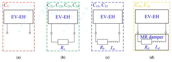 The diagram of the vibration reduction system with the self-sensing and self-powered action of the EV-EH to control the MR damper is shown in Figure 16. The EV-EH coil can be either directly connected to the MR control coil (case C41, C42) or via the power management unit and the control unit. It is apparent that the mechanical energy related to excitation is converted to electrical energy. However, it should be considered that a portion of the mechanical energy is dissipated in the system as heat [31].