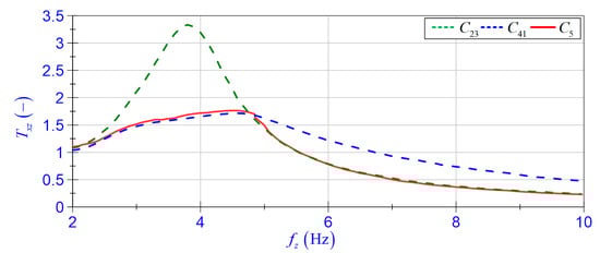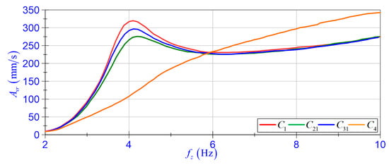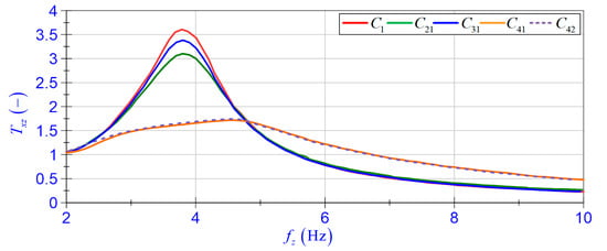 The vibration reduction system effectiveness is determined by the coefficient (see Figure 18). It can be seen that in the frequency range, the values of coefficient in case are nearly the same as in case . However, at frequencies higher than , the values are nearly the same as in case . This proves that the studied system operated correctly.