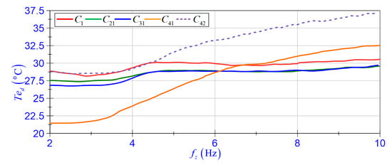 Figure 7 presents the plots for cases , , , and . As can be observed, the value depends on the current level in the EV-EH coil circuit. One can also observe the boundary frequency , below which the energy supplied to the MR damper control coil decreased the sprung mass vibration amplitude. At frequencies higher than , the MR damper control coil should be disconnected from the EV-EH coil and replaced by an energy storage unit. Additionally, the plots in Figure 8 present the relationship of the average MR damper housing temperature in a function of frequency (), indicating that in the range, the temperature does not have a significant impact on the coefficient value (cases and ). In a wider range, a possible impact of temperature on the coefficient value can be adjusted using a temperature-sensitive controller, as shown by Batterbee et al. [30].