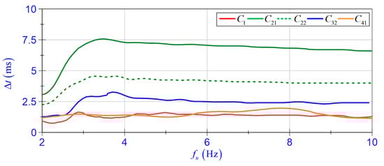It should be noted that the time shift coefficient depends on the load of the EV-EH coil and frequency (see Figure 10). The adopted sampling frequency of measured values , enabled determining the time shift coefficient with an accuracy of .