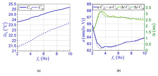 (a) Mean value of harvester housing temperature vs. frequency ; (b) gain and time shift coefficient vs. frequency .