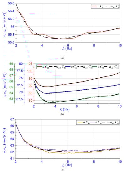 Taking into account the relative velocity as a reference, the values of gain and offset were calculated using the singular value decomposition method. In step five, the relationship between gain and frequency , resulting from the change of voltage for cases –, was determined. In step six, the linear correlation coefficient (known as Pearson’s correlation) between and was calculated.
