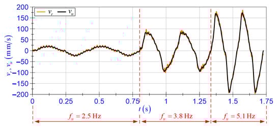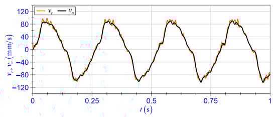 The self-sensing function was calculated by the control unit according to Equation (4) and gain function adopted in accordance with the values of polynomial coefficients . The quality of representation of the relative velocity by self-sensing function can be assessed based on the values of linear correlation coefficient and time patterns (see Table 4 and Figure 19). Figure 19 presents the time pattern of the self-sensing function and relative velocity at frequency As can be observed, the self-sensing function exhibited high accuracy when compared to the relative velocity .