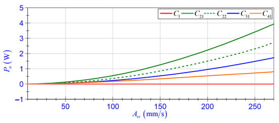 Taking into account the energy conversion, the power flow depends on the relative velocity and the EV-EH coil load. As a result of the insignificant impact of the MR damper coil inductance (, ) or (, ), the power factor (ratio of active power and apparent power) is close to one, thus the self-powered capability can be expressed as a mean value of instantaneous power:
