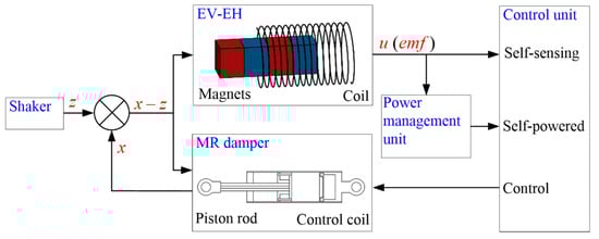 The work is organised in the following manner. Section 2 and Section 3 present the structure of the EV-EH and the MR damper. Section 4 investigates the self-sensing function and self-powered capability and discusses the obtained results. Section 5 describes the implementation and testing of self-sensing and self-powered actions to demonstrate their applicability for MR damper control. Final conclusions are provided in Section 6.