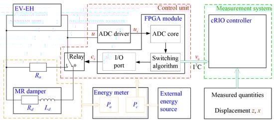 Figure 17 presents a practical implementation of the self-sensing and self-powered action in the vibration reduction system. The main elements of the system include the EV-EH, the MR damper, the resistance of the load , the control unit, the energy meter, and the measurement system. The control unit consists of an ADC driver (analogue to digital converter), signal relay and embedded FPGA module DE10-Lite [33]. The application layer of the control algorithm was developed in the Quartus environment. The input voltage was first converted into standard ( signal), then measured by a built-in FPGA ADC core. The control algorithm calculates the frequency and determines the self-sensing function. The self-sensing function was used to decide to switch the load using the I/O port and the relay from the MR damper coil to the resistance. Taking into account the displacement transmissibility plots in Figure 7, the following values of control signal were used: