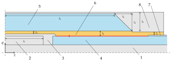 Figure 1 shows a schematic of the investigated HVDC cable joint in an axisymmetric coordinate system, . The different materials are indicated by numbers in the figure. The two copper conductors (domain 1 in Figure 1) are connected with an aluminum connector (domain 2). Both, conductor and connector, are covered by a layer of conductive silicone rubber (domain 3). These domains (1–3) are assumed as perfect electric conductors in the simulation. The cable insulation consists of XLPE (domain 4) and the joint insulation of an insulating silicone rubber (domain 5). Both insulation layers are separated by a nonlinear resistive FGM (domain 6). The outer sheaths of the cable (domain 7) and the joint (domain 8) are made of conductive silicone rubber, which is connected to ground potential. The dash-dotted lines indicate the two-dimensional (2D)-axisymmetry along the z-axis and the reflection-symmetry along the -plane. Additionally, the conductive materials are highlighted in grey, the insulating materials in blue and the nonlinear FGM in yellow. The red line marks the evaluation path of the quantities of interest in the section below.