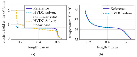 For the numerical validation of the proposed solution scheme, a steady state simulation of the joint model is compared with the simulation results from [24]. For the validation study, a conductor temperature of 60 °C is assumed. Figure 3a shows the tangential electric field distribution and Figure 3b the temperature distribution along the interface between XLPE and FGM, i.e., the red line indicated in Figure 1. A perfect agreement of the result simulated with the HVDC solver and the reference simulation of [24], which was computed with COMSOL Multiphysics®, is obtained.