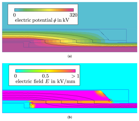 Field distributions in continuous operation, : (a) Potential distribution and (b) electric field strength distribution inside the 2D cross-section of the HVDC cable joint. Equipotential lines are accentuated in black. The resistively graded joint is in steady state operation. The DC high voltage excitation is applied at the conductive silicone that covers the connection of the conductors and at the conductor. Ground potential is applied at the outer conductor of the cable sheath and the outer surface of the joint. Without suitable field grading measures, the material interfaces at the positions indicated by red circular markers would be affected by excessive electric field stress (compare Figure 3).