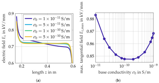 The base conductivity, , in (1) is the dominant conductivity during stationary operation. In the literature, is recommended to ensure decoupling between the insulating layers [23]. Herein, is the largest conductivity of the insulating materials, which is S/m in this model. This lower boundary can be confirmed based on the DC simulation results. A smaller conductivity causes an uneven electric stress distribution along the interface and, thus, increases the peak stress (see Figure 6a). Figure 6b shows the maximum tangential field strength with respect to the base conductivity. A field stress minimum is obtained for a base conductivity of S/m.
