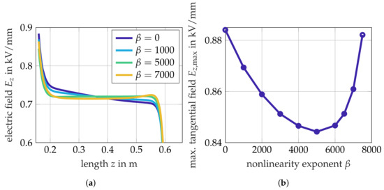 The temperature dependence of DC insulation materials is a well known threat to HVDC cable systems, as it is the reason to the field inversion phenomenon [1]. Fundamental effects on the cable’s insulation have been discussed in [15,32]. For FGM materials as used in cable joints, literature data are available for field dependence only (cf. [31]). In the next step, it is investigated whether the temperature dependence is an important parameter for optimizing resistively graded cable joint designs with FGM layers. The temperature nonlinearity exponent governs the nonlinear temperature dependence in (1). The value , as proposed in [24], serves as a starting point for the investigation. Figure 8a shows that similarly to the previously analyzed base conductivity, there is a “threshold”-value for below which the field stress distribution gets imbalanced, i.e., . As Figure 8b shows, a minimum of the tangential peak field stress exists for .
