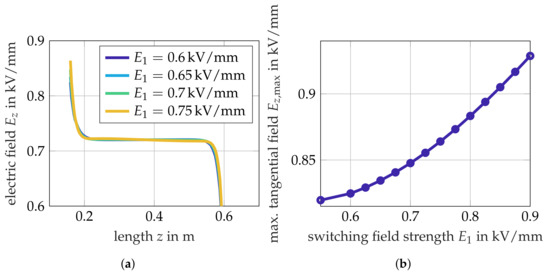 The switching field strength, , determines the operating point at which the conductivity switches from the approximately linear to the nonlinear behavior. Furthermore, decreasing amplifies the slope of the conductivity curves. According to [23], the average tangential electric field along the evaluation path is defined with an additional safety margin of 10%. In our case, this corresponds to a switching field strength of kV/mm. Based on this, the switching field strength is swept in a range between 0.55 kV/mm to 0.9 kV/mm. The investigated variations of do not affect the overall tangential field stress distribution significantly (see Figure 10a) due to the moderate increase of the conductivity above the switching field strength. However, for kV/mm the maximal field strength increases almost linearly. The maximum is located close to the triple point. The switching field strength must, hence, be low enough to clip the field stress at this point.