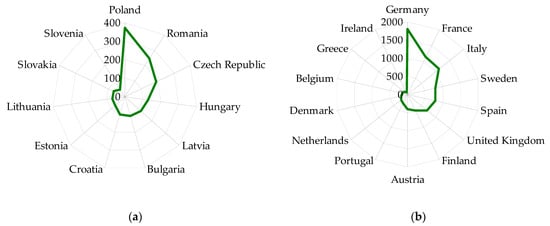 Renewable energy production in EU countries 2018 (PJ): (a) Countries that joined the EU in 2004 or later, (b) Countries that joined the EU before 2004. Source: Own study based on [49].