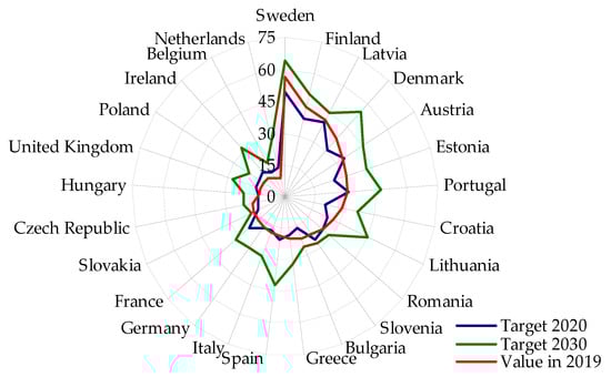 In the case of all analysed EU Member States, there is an upward trend in the share of renewable energy in gross final energy consumption, which is mainly due to the need to achieve the national targets set out in the national plans which are a direct result of EU directives. Most countries (14) have met the 2020 target and 4 have exceeded the 2030 target. The most dynamic changes in 2019 compared to 2010 occurred in Denmark, Finland, and Sweden, which allowed these countries to significantly exceed their 2020 targets by 9.22%, 6.39%, and 8.32%, respectively.