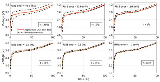 To form a pack of LIBs with high power, LIB cells are connected in parallel and series to obtain the desired power and voltage. The remaining power in each LIB cell is indirectly reflected in its state of charge (SoC), which ranges from 0% to 100%. SoC depends on many factors including the voltage of the cell, ambient temperature of the cell, aging of the cell, and charging/discharging scenario []. Figure 1 shows the particular relationship between SoC and cell voltage at various temperatures.
