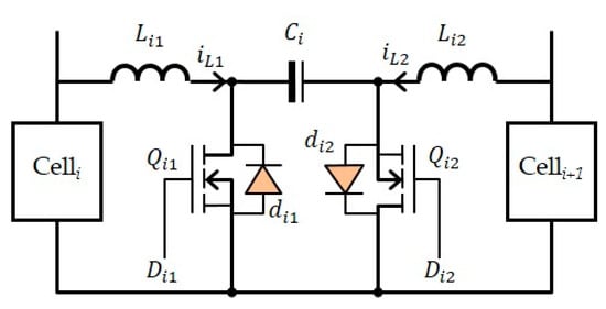 The model of SoC balancing circuit based on conventional bidirectional Cuk converter i for two adjacent cells i and i + 1 is shown in Figure 3. and represent two inductors, is a capacitor, and are two MOSFETs, and and are two diodes of the MOSFETs.
