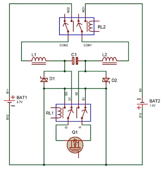 The disadvantage of the original Cuk circuit when applied to the SoC balancing circuit is that it uses two MOSFETs to control the energy transfer in two directions. For the SoC balancing control of an n-cell LIB pack, an n − 1 balance circuit is required based on the conventional Cuk circuit. To open the MOSFETs in the n − 1 balance circuit, we require DC power with n differential voltage levels, hence resulting in an inconvenient circuit. However, practically, when the SoCs of all cells are in equilibrium, the n − 1 balance circuit would still be connected to the circuit; this would cause leakage current through the capacitors between the two cells, leading to damage and energy loss. In this study, to overcome the above disadvantages, the SoC balancing circuit is formed using only one MOSFET and a relay to control the energy transfer between two adjacent cells; another relay is used to cut off the SoC balancing circuit from the two cells when the two cells have the same SoC level. When the SoC is balanced, Relay 1 is opened, and the balance circuit separates from the two cells; hence, the loss of electrical energy to the balance circuit is zero when compared with the case in which the balance circuit is still connected between two cells. The SoC balancing circuit is driven by a microprocessor using the RS485 communication protocol. The modified Cuk converter-based SoC balancing circuit is depicted in Figure 4.