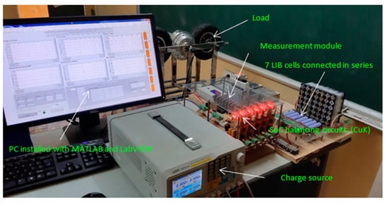 The experimental system is shown in Figure 6. The Samsung LIB pack includes seven series-connected cells. To estimate the SoC of cells and calculate the dynamics of the SoC balancing system (19), a second-order equivalent circuit model was used. The parameters of the cell model used in the experiment were determined based on the least squares method by using the particular charge/discharge scenarios [].