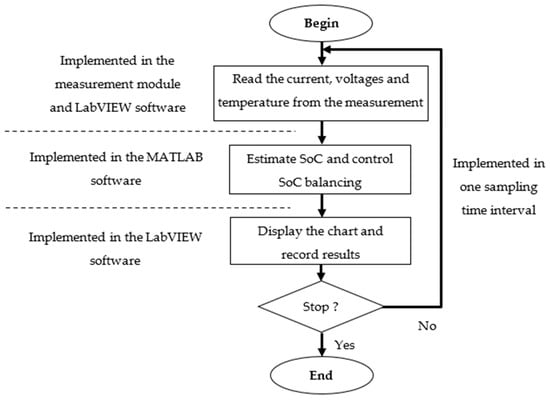 The SoC estimation algorithm and optimal SoC balancing control algorithm were coded in MATLAB script and then embedded in the LabVIEW environment to estimate and display the SoC of cells, current, and voltages of cells in real time. The sampling time interval was set to 10 s.