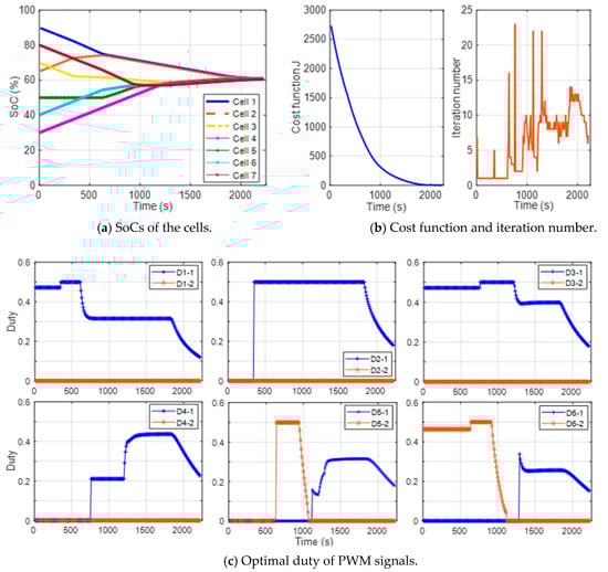 As shown in Figure 8a, the SoC values of the seven cells gradually converged to 60%, which is the average of the initial SoC values. SoC balancing took approximately 2218 s, during which the cost function decreased from 2767 to 24 (see Figure 8b left). The iteration number at each control time interval is shown in Figure 8b (right).