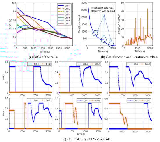 Another finding from Figure 9b is that the number of iterations increases if there are groups of cells with nearly equal SoC value. For example, at 1400 s, the SoC values of cells 4, 5, and 6 are almost the same at 37%, thus the iteration number exceeds 30. At 915, 1925, and 2316 s, the cost function did not decrease, although the SoC values of the cells were considerably different. In such cases, the proposed initial point selection algorithm was applied, and the SoC was successfully balanced.