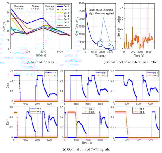 Test scenario with charging and discharging alternately: (a) SoCs of the cells under the optimal SoC balancing control, (b) cost function, and (c) optimal duties applied to the SoC balancing circuits.