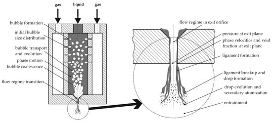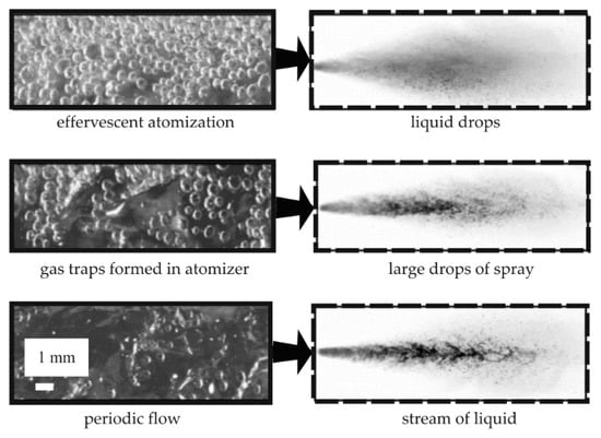 - Rahman, M.A.; Balzan, M.; Heidrick, T.; Fleck, B.A. Effects of the gas phase molecular weight and bubble size on effervescent atomization. Int. J. Multiph. Flow 2012, 38, 35–52. [Google Scholar] [CrossRef]