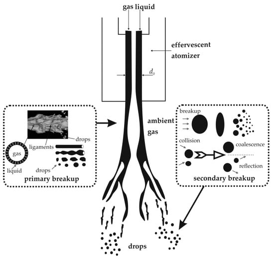 - Sovani, S.D.; Sojka, P.E.; Lefebvere, A.H. Effervescent atomization. Prog. Energy Combust. Sci. 2001, 27, 483–521. [Google Scholar] [CrossRef]