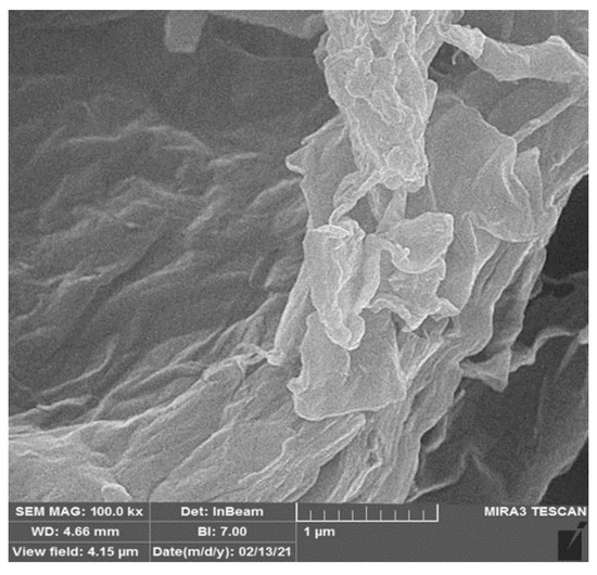 FESEM tests were performed using TESCAN-MIRA III. The FESEM test analyzed the morphology and structure of graphene oxide nanoparticles. The FESEM image in Figure 1 shows the planar structure of graphene oxide nanoparticles. Graphene Oxide particle has a one nano dimension and 2D microscale. The physical structure of a particle depends on the method of synthesis possess.