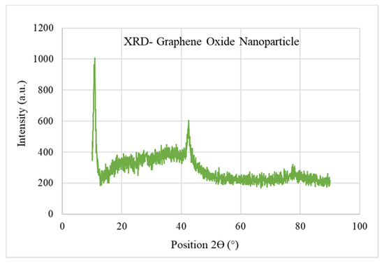 Normal XRD test was performed using PHILIPS-PW1730. The scan was conducted from 10 to 90 degrees. Step size and time per step were used 0.05 degrees and 1 s, respectively. The XRD analysis was carried out to investigate the crystal structure of graphene oxide nanoparticles. This analysis is also known as the Bragg formulation of X-ray diffraction. The XRD image of graphene oxide nanoparticles is shown in Figure 3. The atomic structure of graphene oxide nanoparticles is confirmed by the peaks generated. The peaks in graphene oxide nanoparticles were seen at 11.15° and 42.5°. The results of the XRD test presented are similar to the results of previous studies [21].