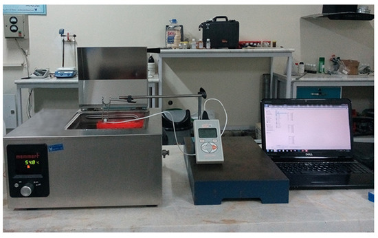 The thermal conductivity of nano lubricant was measured using the transient hot-wire method (THWM) and according to ASTM D2717-95 standard. In this research KD2-Pro thermal property analyzer (Decagon Device, USA) was used. Thermal conductivity was measured under varying temperature conditions ranging from 35 °C to 75 °C. The KS-1 sensor was used for measurement and the temperature bath (model WNB 7 Memmert) to stabilize the temperature was used. According to the certificate of the KD2-Pro thermal property analyzer, the results measure by the KS-1 sensor can have a maximum of 5% error. At first, the accuracy of the analyzer was cheeked by using Glycerin verification standard and also pure water. Secondly, the temperature bath and thermal property analyzer have been run and, for measuring, we must wait to find a stable temperature and isothermal situation in the system. In this research, every sample was measured at least three times and the error was calculated. In Figure 5, experimental setup is presented.