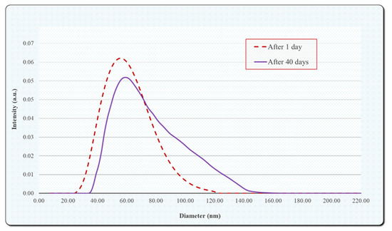 For evaluation of the particle size of nanoparticles, a particle size analyzer, namely, the VASCOTM nanoparticle size analyzer made by Cordouan technologies company, was used. The test was done two times, after one day and 40 days. According to Stokes’ law, the stability of graphene oxide nanosheets in viscous oil is prolonged because of the properties of nanosheets. The nanoparticles have a high specific surface area (SSA) and a planar structure, which reduces the sedimentation velocity. Figure 5 shows the results in detail. The stability of nano lubricants in the long term is a critical feature in practical applications. The average particle size is visible by the device when the laser beam strikes the nanoparticles dispersed in the oil. Data on the nanoparticle size range are according to the Mie scattering theory [25]. The results were measured; the first time was after one day and then after 40 days. The results in Figure 6 are presented. It can be seen, the majority of particles size were in a nanoscale range even after 40 days. In addition, for the second test, the nano lubricant was in a static situation ultimately. The result is acceptable because there is not any agglomeration.