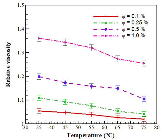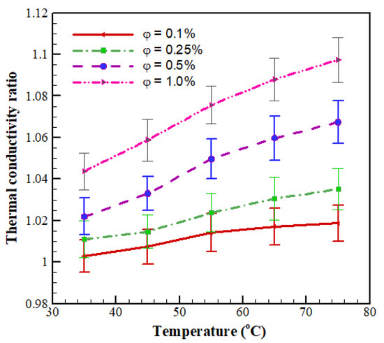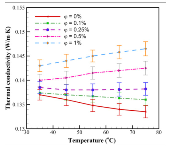 The relative thermal conductivity at various temperatures and volume fractions is shown in Figure 8. This parameter is obtained by dividing the thermal conductivity of the nanofluid by the thermal conductivity of the base fluid. According to the results, the rate of thermal conductivity increases with increasing temperature. In this experiment, when the temperature rises, the molecules of the base fluid accelerate at high speeds, which cause the Brownian motion of the solid nanoparticles by accidental collision and impact on the surface of the nanoparticles, thereby increasing the thermal conductivity of the nanofluid [27,28]. The maximum improvement of thermal conductivity (9.73%) was observed at 75 °C and a volume fraction of 1%.