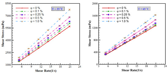 Effects of temperature on rheological behavior were investigated and the nano lubricant had Newtonian behavior from 35 °C to 75 °C. The shear stress has a linear trend in all volume fractions, so only the results for 35 °C and 65 °C were presented.
